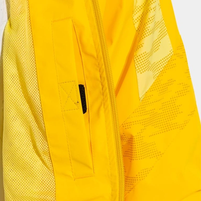 Men's/boy's raincoat. This comfortable and practical waterproof jacket has been designed to facilitate movement and sports activities in rain or wind. Get maximum insulation against water leaks without sacrificing sweat transpiration. This raincoat with a full-zip closure and high collar has adjustable elastic cuffs and hem to optimize insulation. It incorporates a hidden hood, since it is self-storing and at the same time removable. In addition, it includes hidden zippered side pockets that provide secure storage for small items and stylizes the garment. It is made with lightweight and waterproof fabric thanks to Water-Resistant technology. In the areas with the most sweating, it incorporates Micro-Mesh technology to improve perspiration and increase ventilation, helping to maintain body temperature and avoiding bad odours. It presents a design with contrasting color lines in the shoulder area. A basic and essential raincoat for running in the rain. Embroidered J logo.