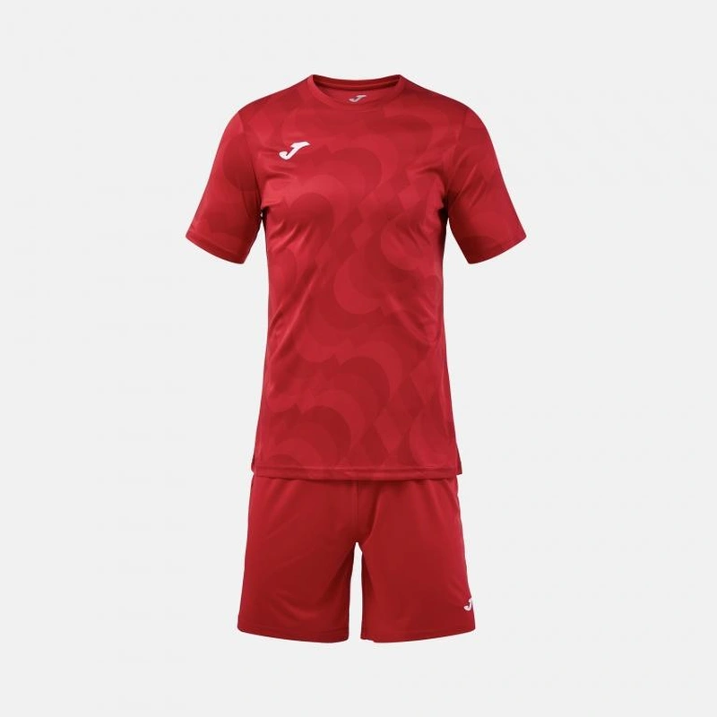 The shirt features short sleeves, a round neck in the base fabric, and a sublimated design. The shorts have an elastic waistband with an inner drawstring to adjust the fit.