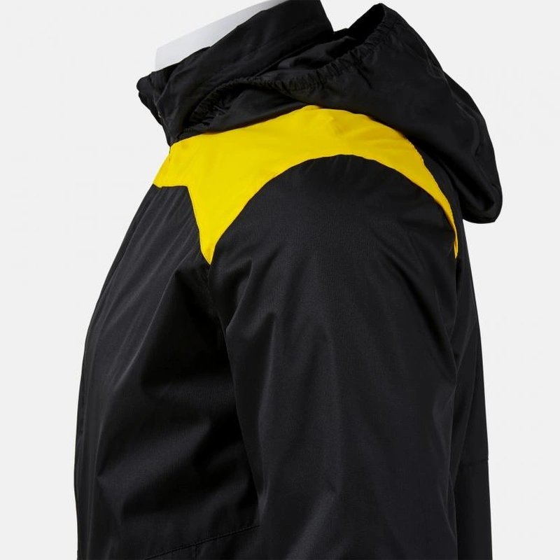 It includes a full waterproof zipper closure to prevent water leaks. It also has an ergonomic and self-storing hood, which can be hidden in the pocket of the closed neck with a zipper, and elastic cuffs.