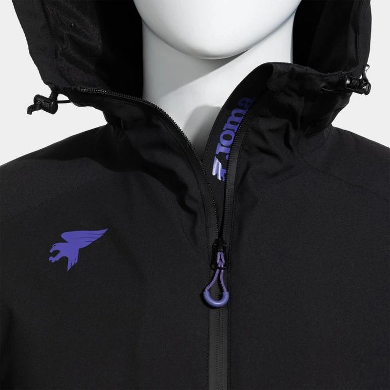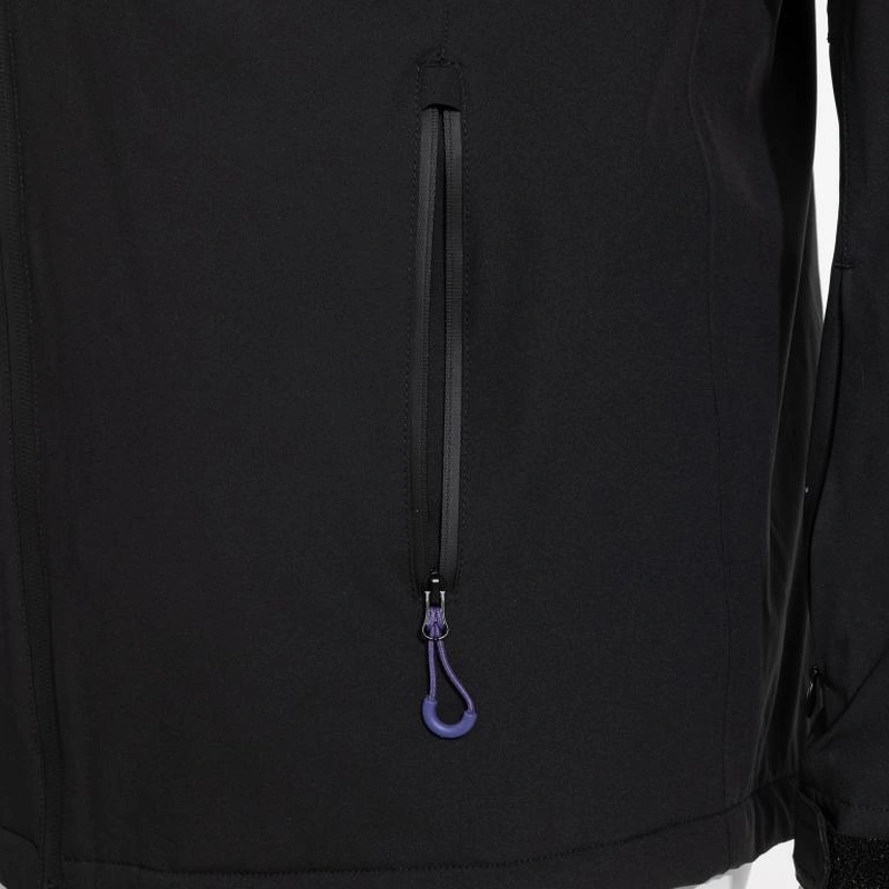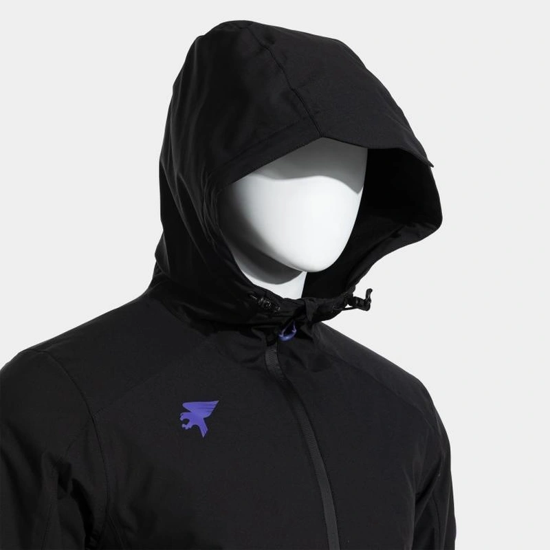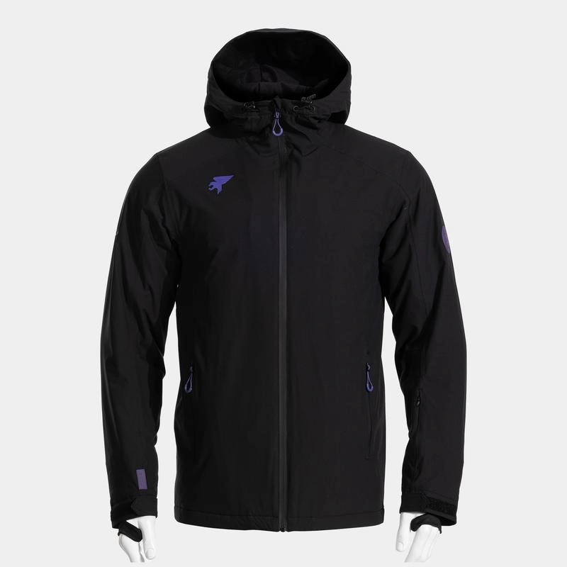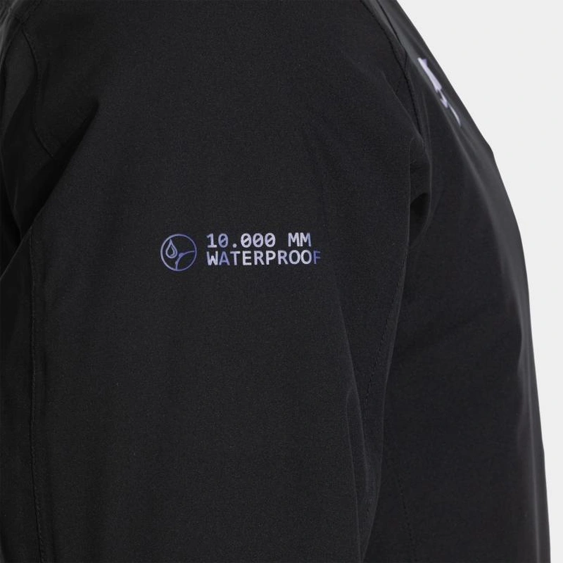 Warm jacket made with completely waterproof fabric (10,000 mm membrane). High-end, highly resistant to sleet, prolonged moisture, and wind. Interior features thermal insulation with fleece lining and padded section for added warmth.
