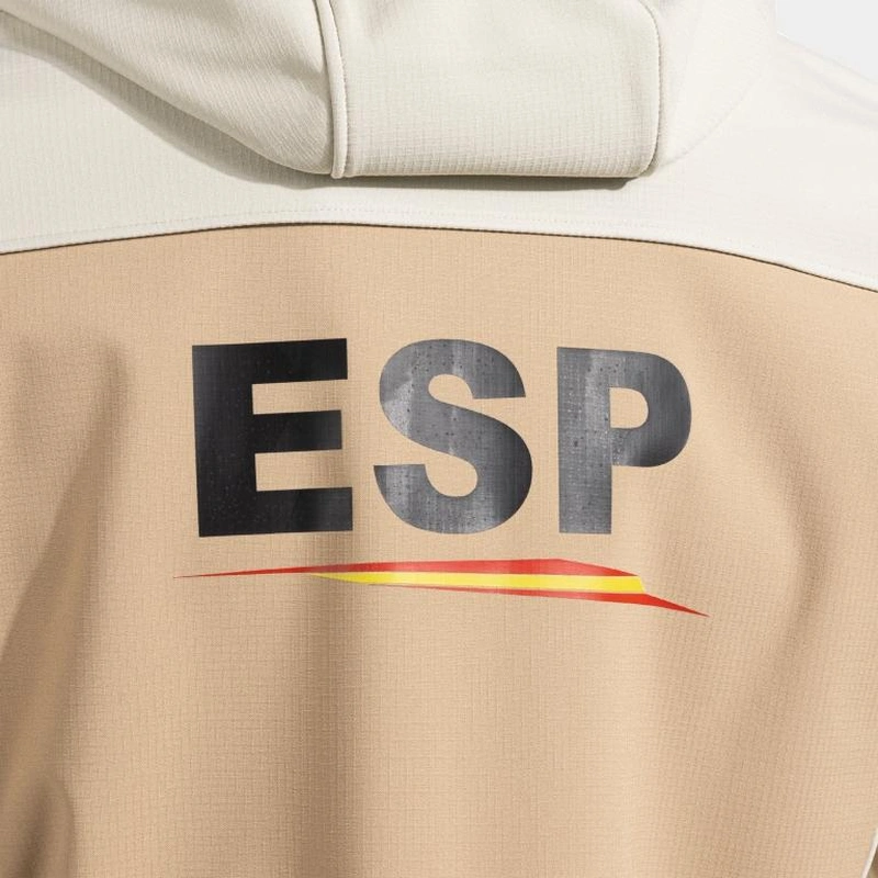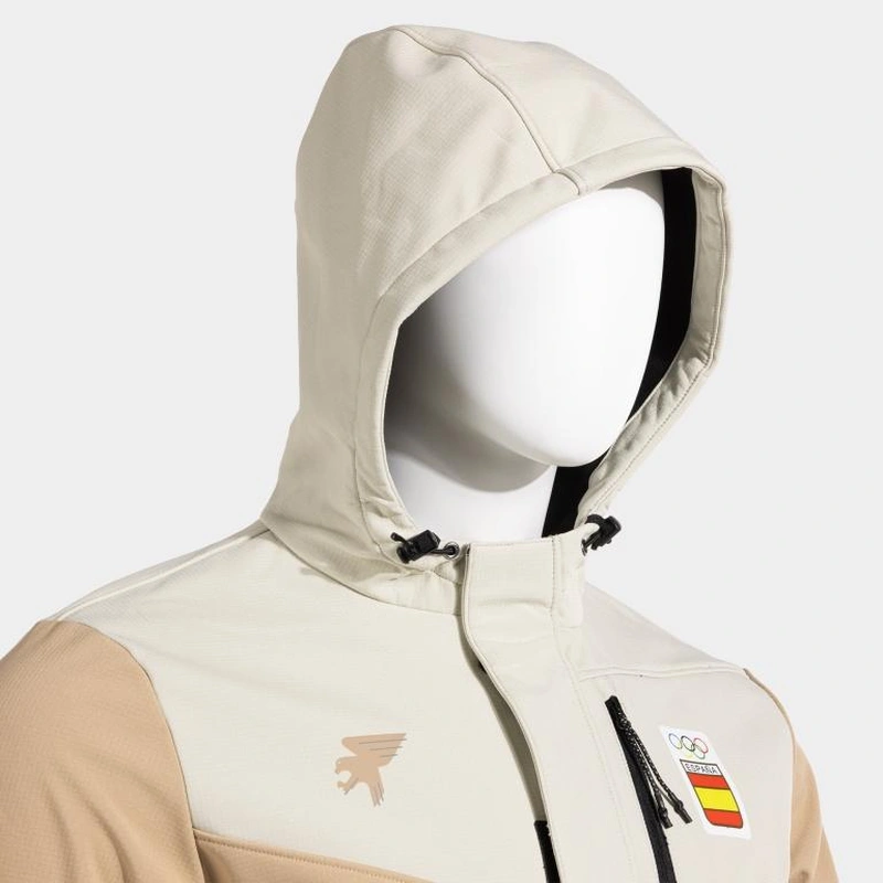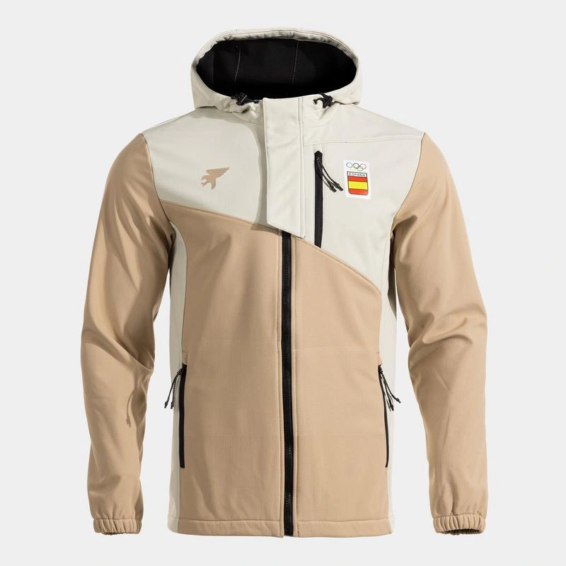 It features an adjustable hood with stoppers, elastic adjustments on cuffs and hem, and three zippered pockets with lockable zipper and puller for quick access.