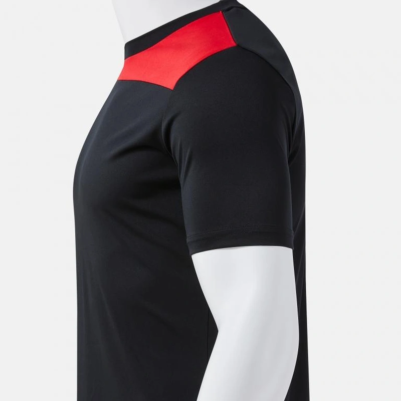 Футболка з короткими рукавами характеризується еластичною круглою горловиною, що дозволяє вільно рухатися. Крім того, вона має лінію контрастного кольору у верхній частині грудей, яка виділяється з основного кольору та поєднується з іншими деталями.